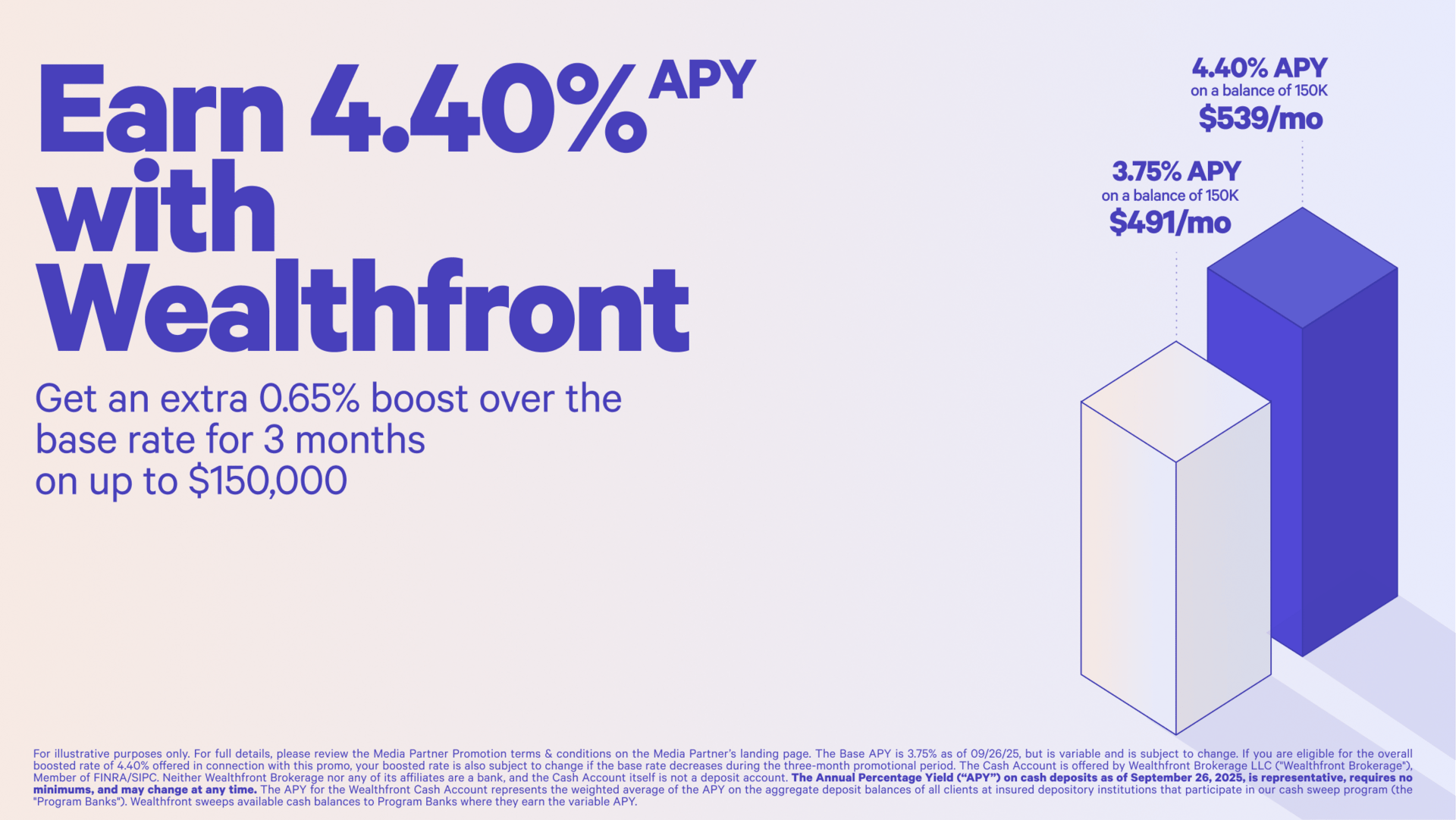 The Cash Account, which is not a deposit account, is offered by Wealthfront Brokerage LLC (“Wealthfront Brokerage”), Member FINRA/SIPC. Wealthfront Brokerage is not a bank. The Annual Percentage Yield ("APY") on cash deposits as of September 26, 2025, is representative, requires no minimum, and may change at any time. The APY reflects the weighted average of deposit balances at participating Program Banks, which are not allocated equally. Funds in the Cash Account are swept to Program Banks where they earn a variable APY and are eligible for FDIC insurance. Conditions apply. For a list of Program Banks, see: www.wealthfront.com/programbanks.
