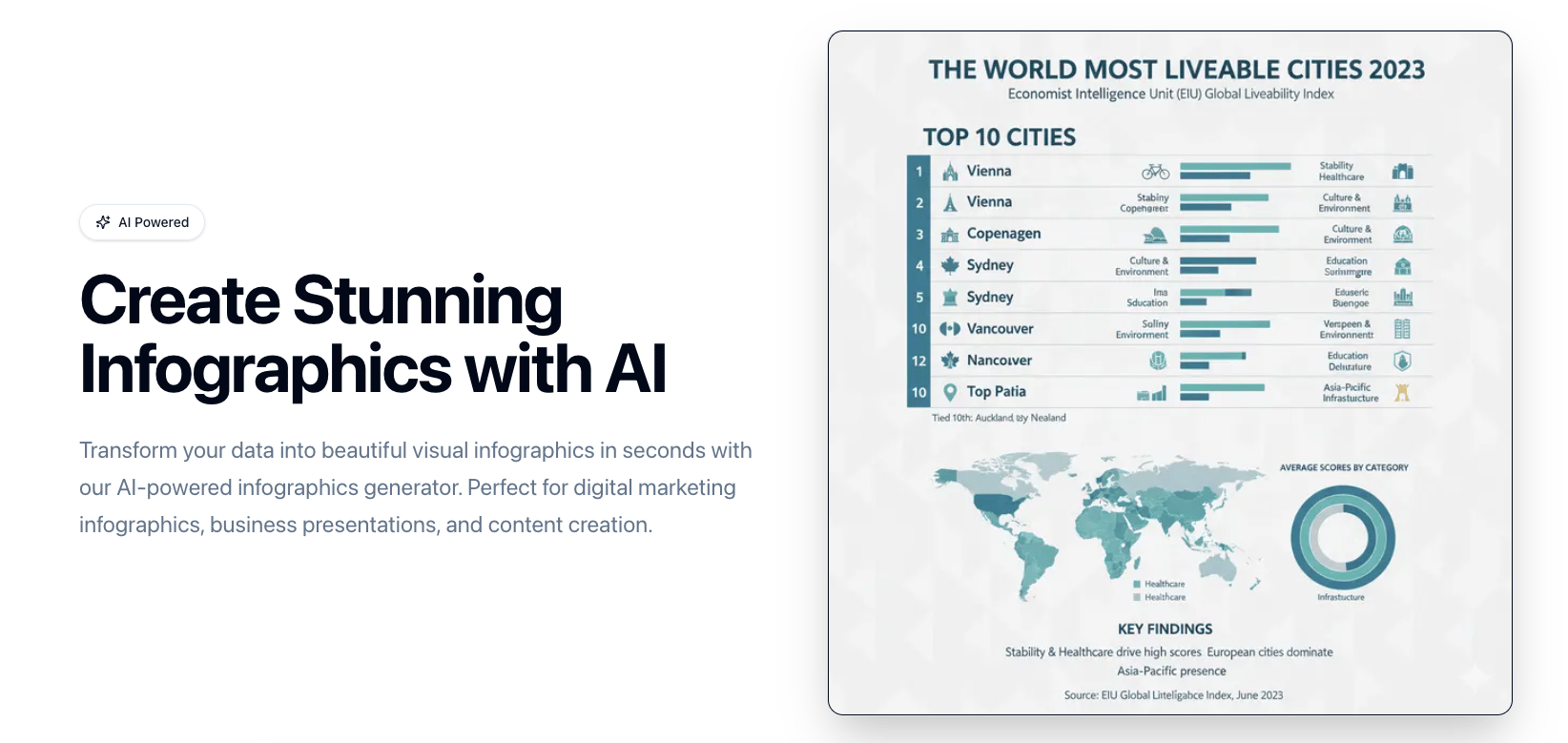 Genaraera turns simple prompts or pasted data into professional, template-free infographics by automatically selecting layouts, charts, colors, and typography for you.