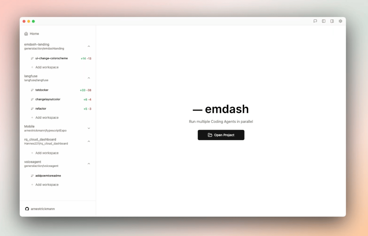 emdash is an orchestration layer for running multiple AI coding agents in parallel, isolating each one in its own Git worktree so you can launch, monitor, compare, and review their work from a single interface.