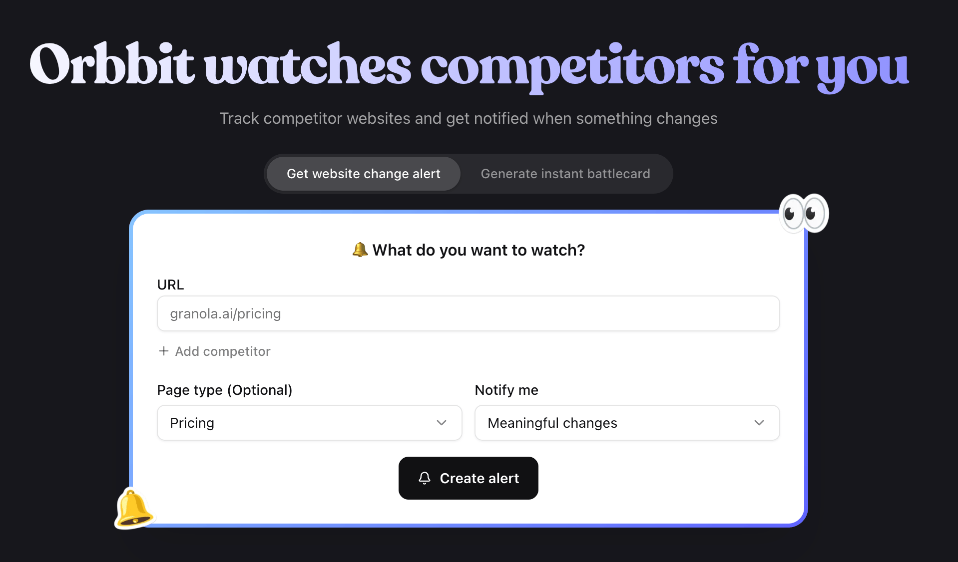 Orbbit tracks competitor websites and notifies you when something changes—pricing, positioning, product updates, hiring, funding, and more.