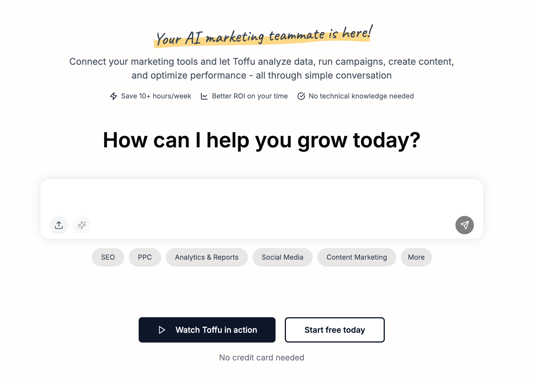 Toffu AI automates campaign management, content creation, and data analysis across tools like Meta Ads, LinkedIn, and Google Analytics—all through natural-language chat.