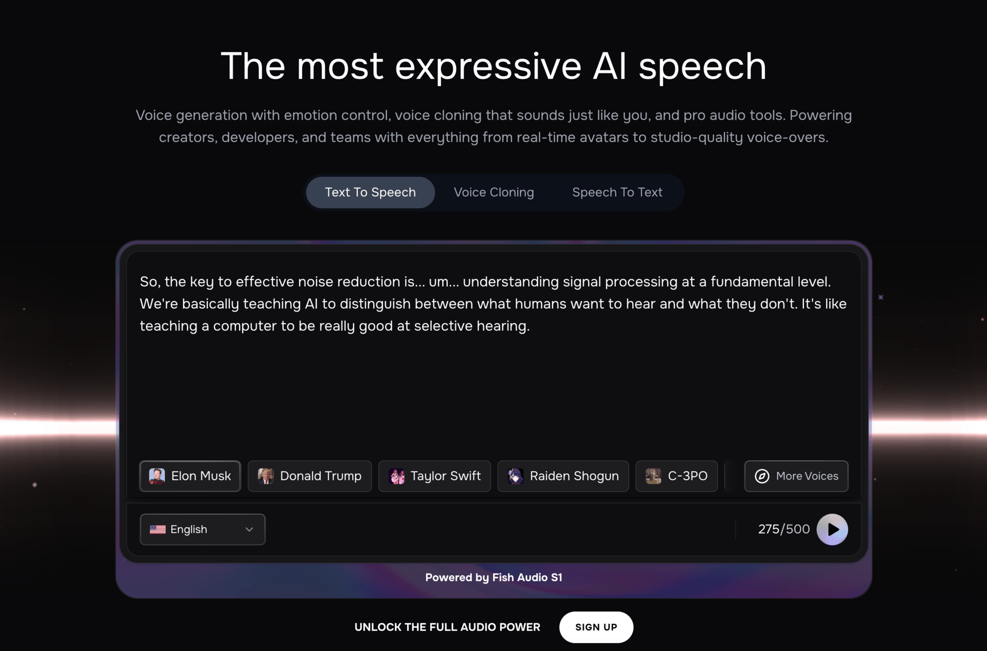 Fish Audio is a voice generation tool that actually sounds natural. It offers 200,000+ voice models, fine-tuned expression tags, and fast cloning from short samples.