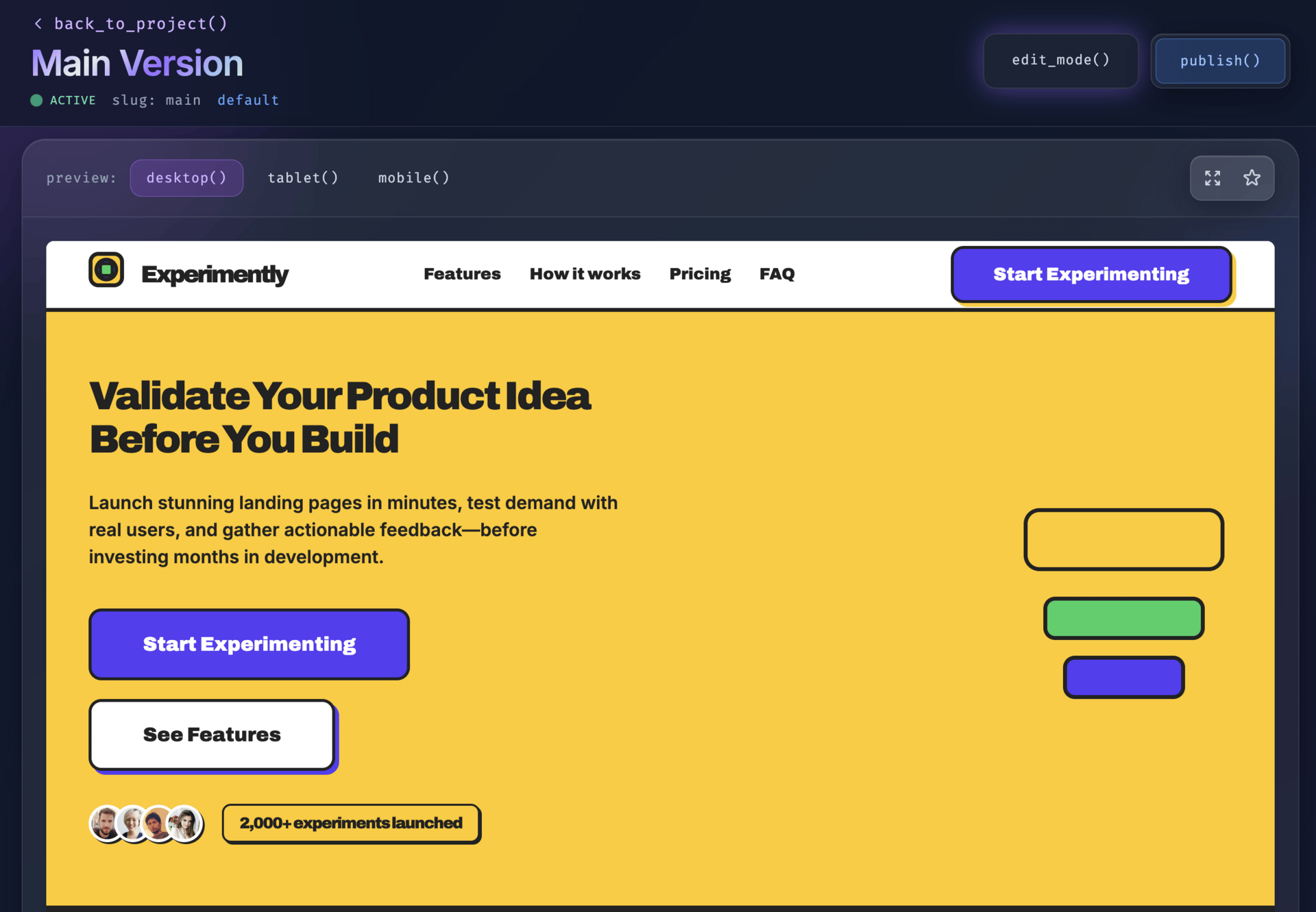 Experimently is a no-code AI landing page builder that lets you quickly spin up and validate ideas with built-in lead capture, analytics, custom domains, and more.